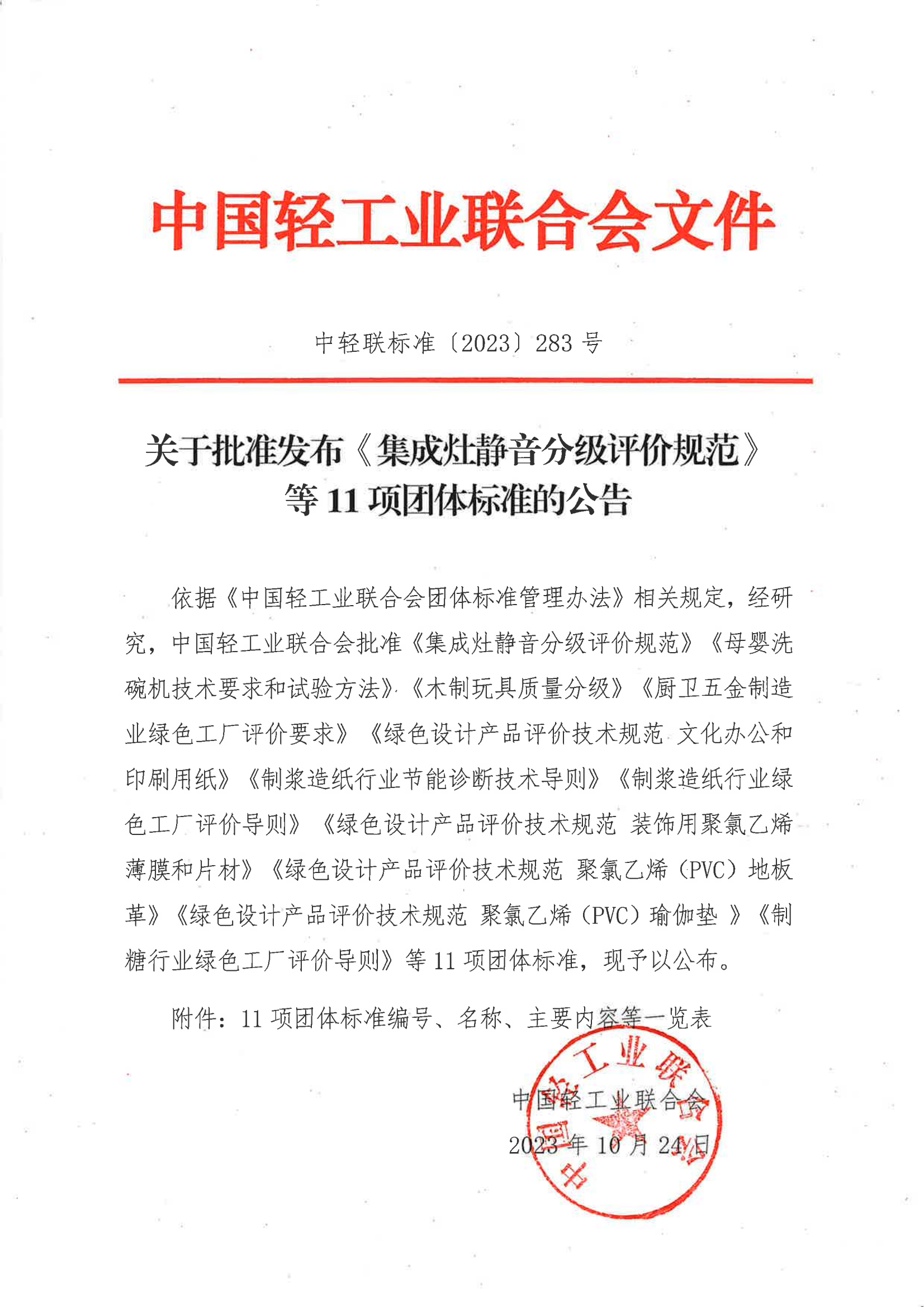 "糖心视频高清" 关于批准发布《集成灶静音分级评价规范》等11项团体标准的公告
