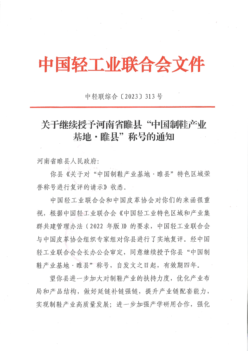关于继续授予河南省睢县“中国制鞋产业基地·睢县”称号的通知