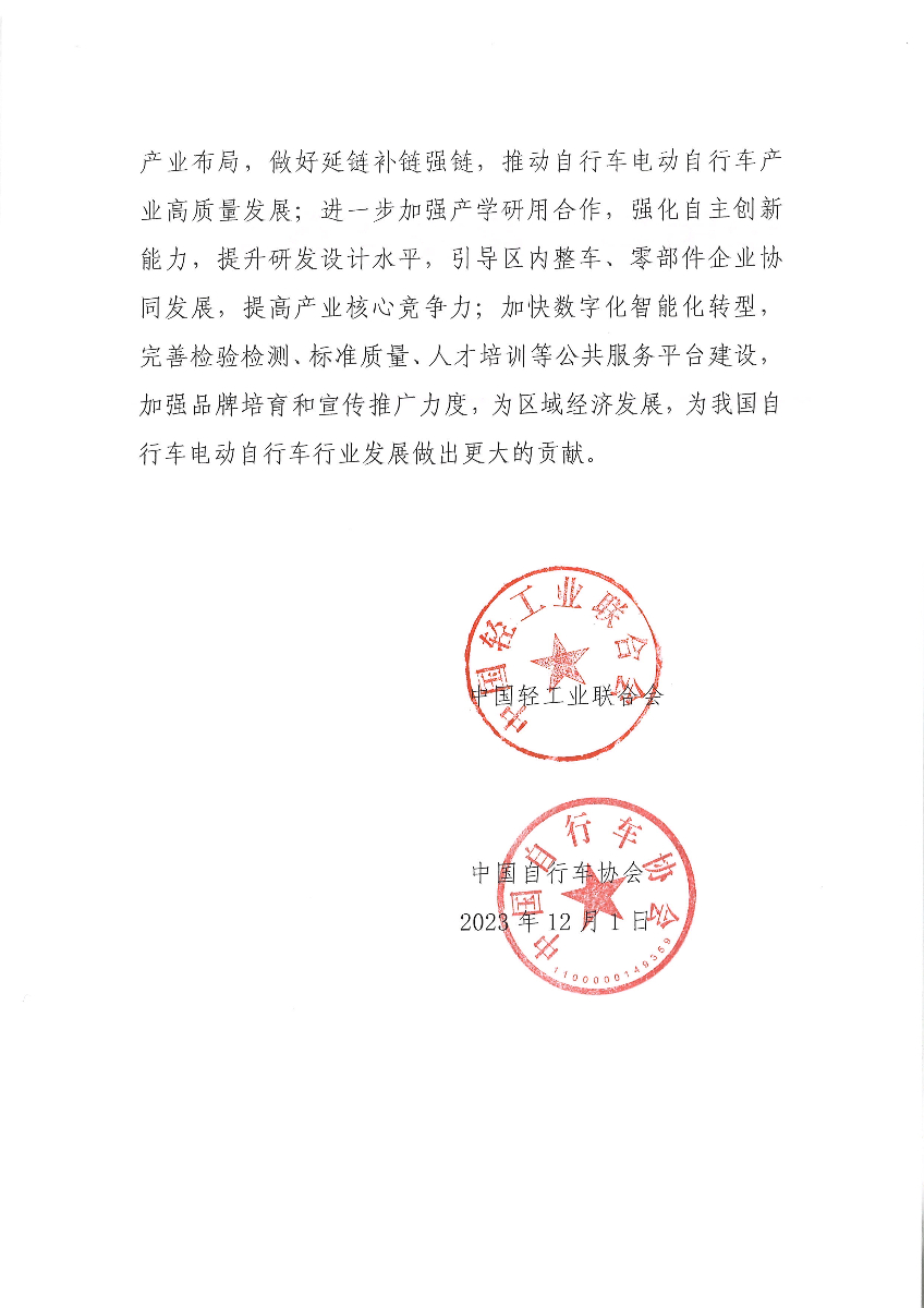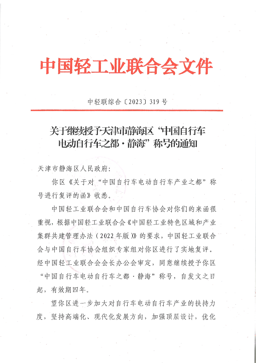 关于继续授予天津市静海区“中国自行车电动自行车之都·静海”称号的通知