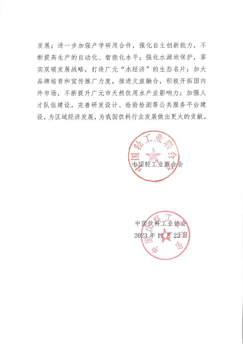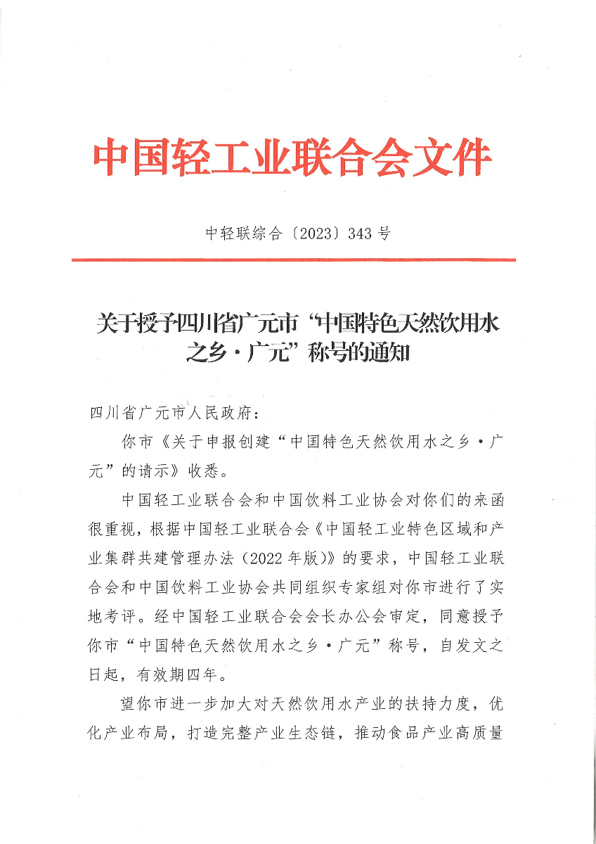 "糖心视频" 关于授予四川省广元市“中国特色天然饮用水之乡·广元”称号的通知