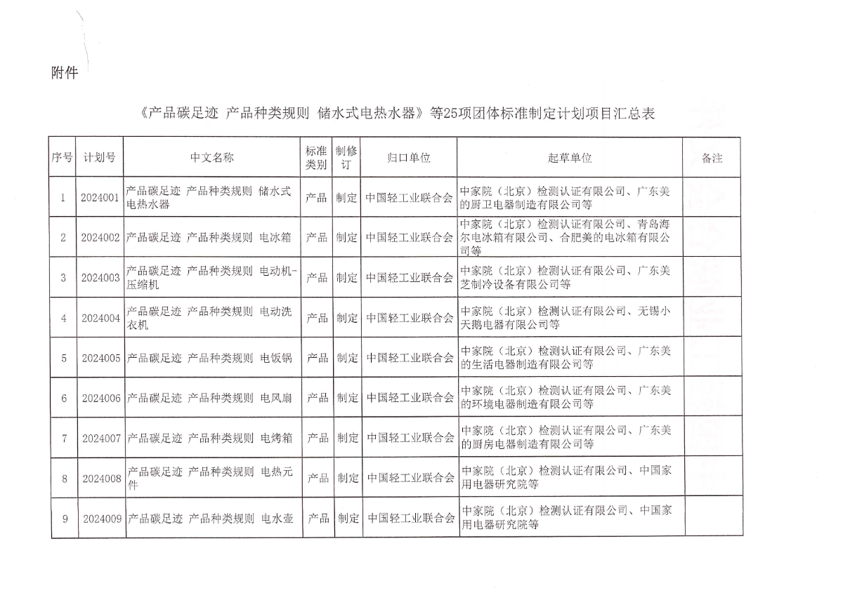 关于下达《产品碳足迹 产品种类规则 储水式电热水器》等25项糖心视频业联合会团体标准计划的通知