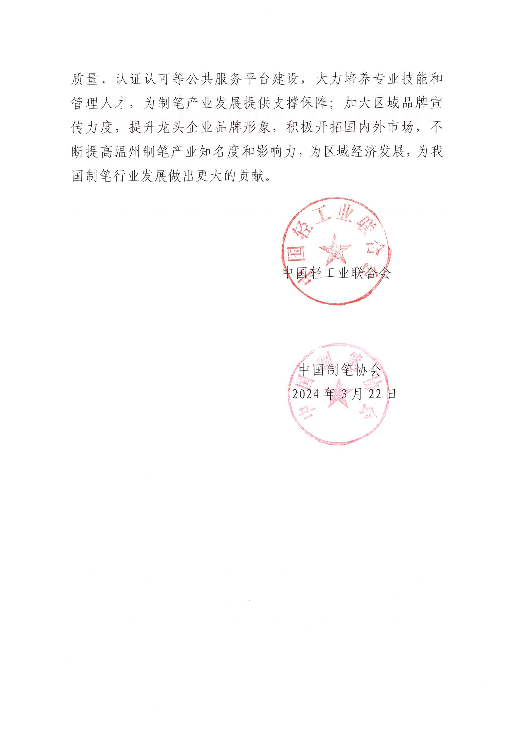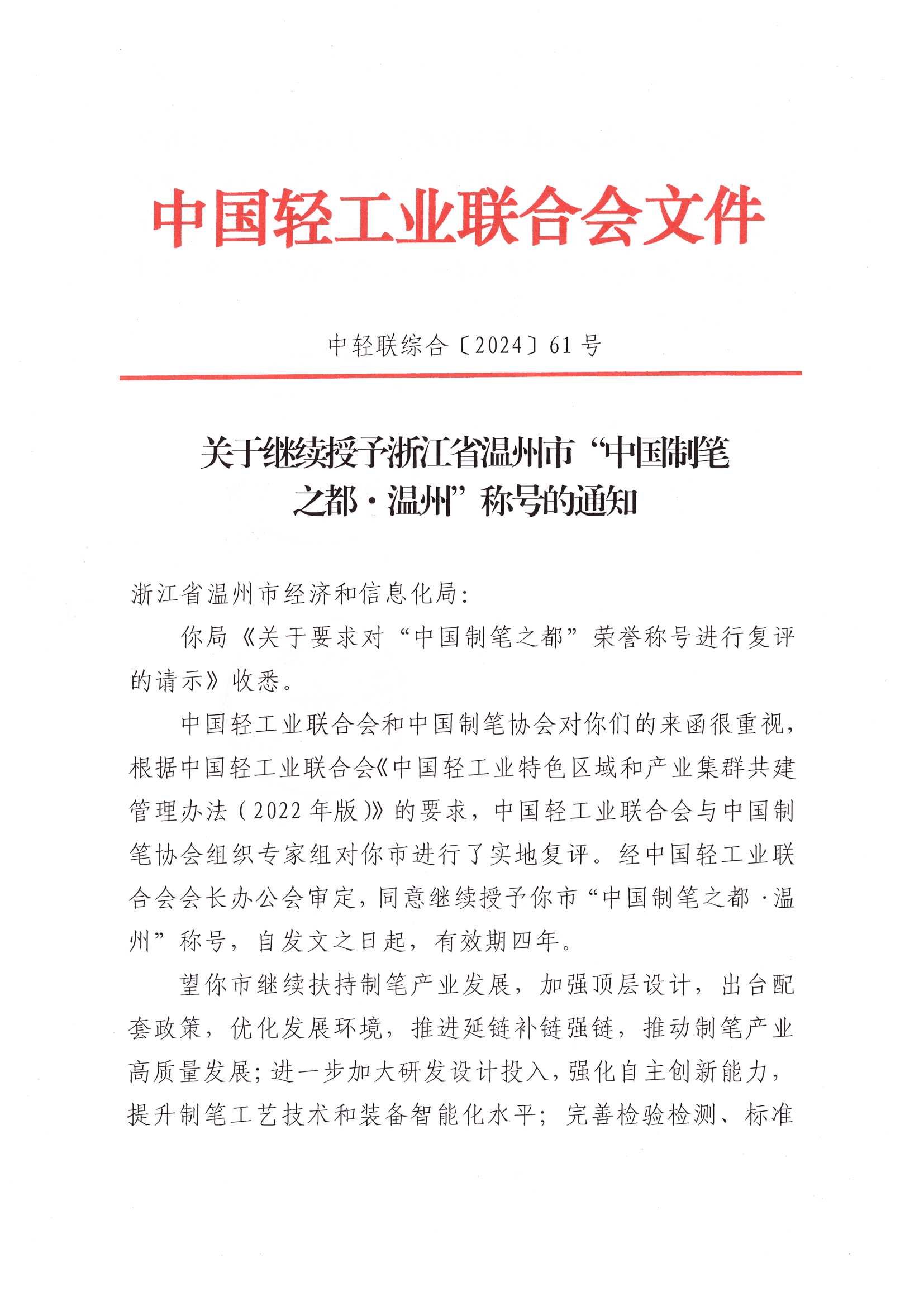 关于继续授予浙江省温州市“中国制笔之都·温州”称号的通知