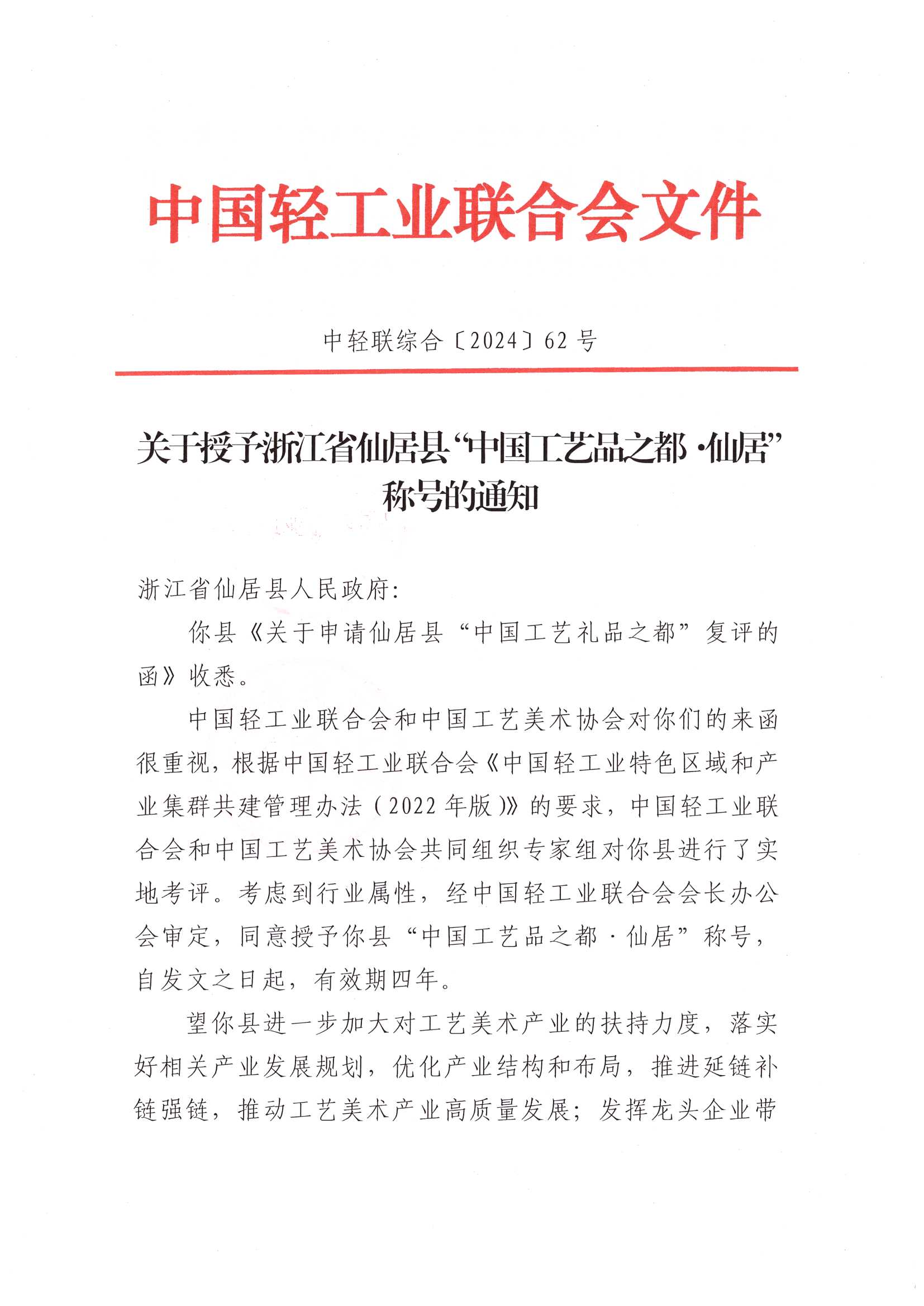 关于授予浙江省仙居县“中国工艺品之都·仙居”称号的通知