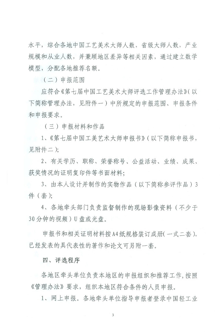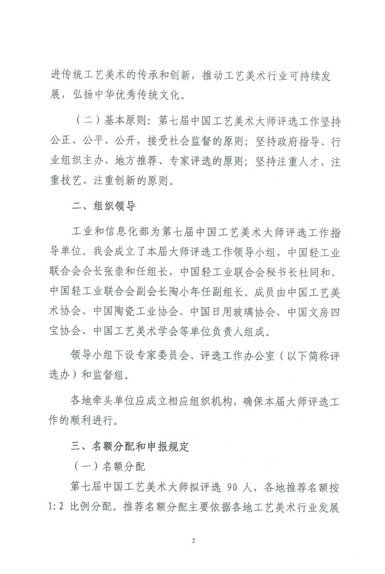 轻工业联合会>专题新闻>第七届中国工艺美术大师评选工作专题>通知公告关于开展第七届中国工艺美术大师评选工作的通知2017-08-24 来源:糖心视频业联合会附件下载:1、附件一:第七届中国工艺美术大师评选工作管理办法2、附件二:第七届中国工艺美术大师申报书3、附件三:第七届中国工艺美术大师推荐名额分配表4、附件四:第七届中国工艺美术大师推荐申报者汇总表