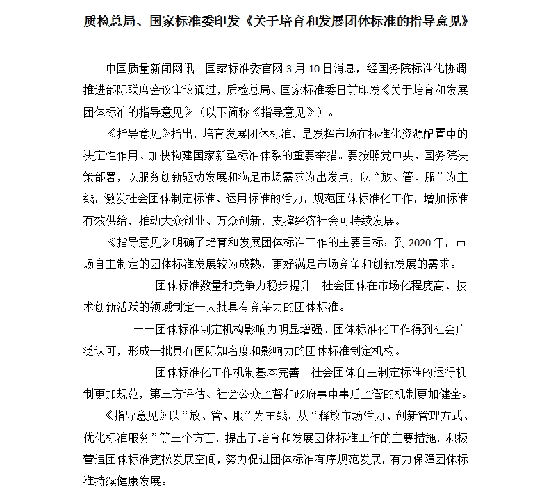 质检总局、国家标准委印发《关于培育和发展团体标准的指导意见》