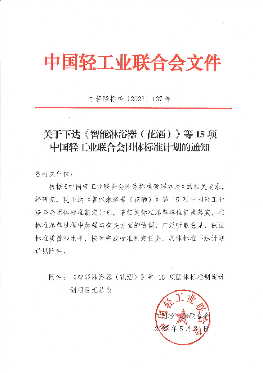 关于下达《智能淋浴器(花洒)》等15项糖心视频业联合会团体标准计划的通知
