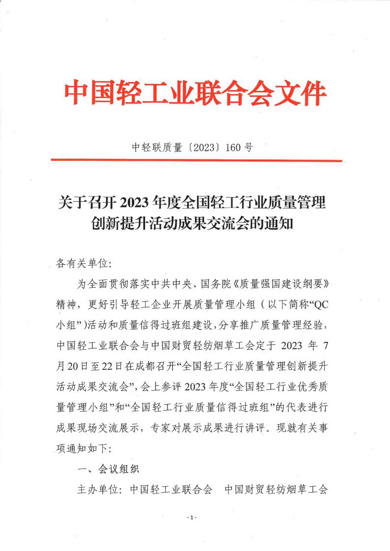 关于召开2023年度全国轻工行业质量管理创新提升活动成果交流会的通知