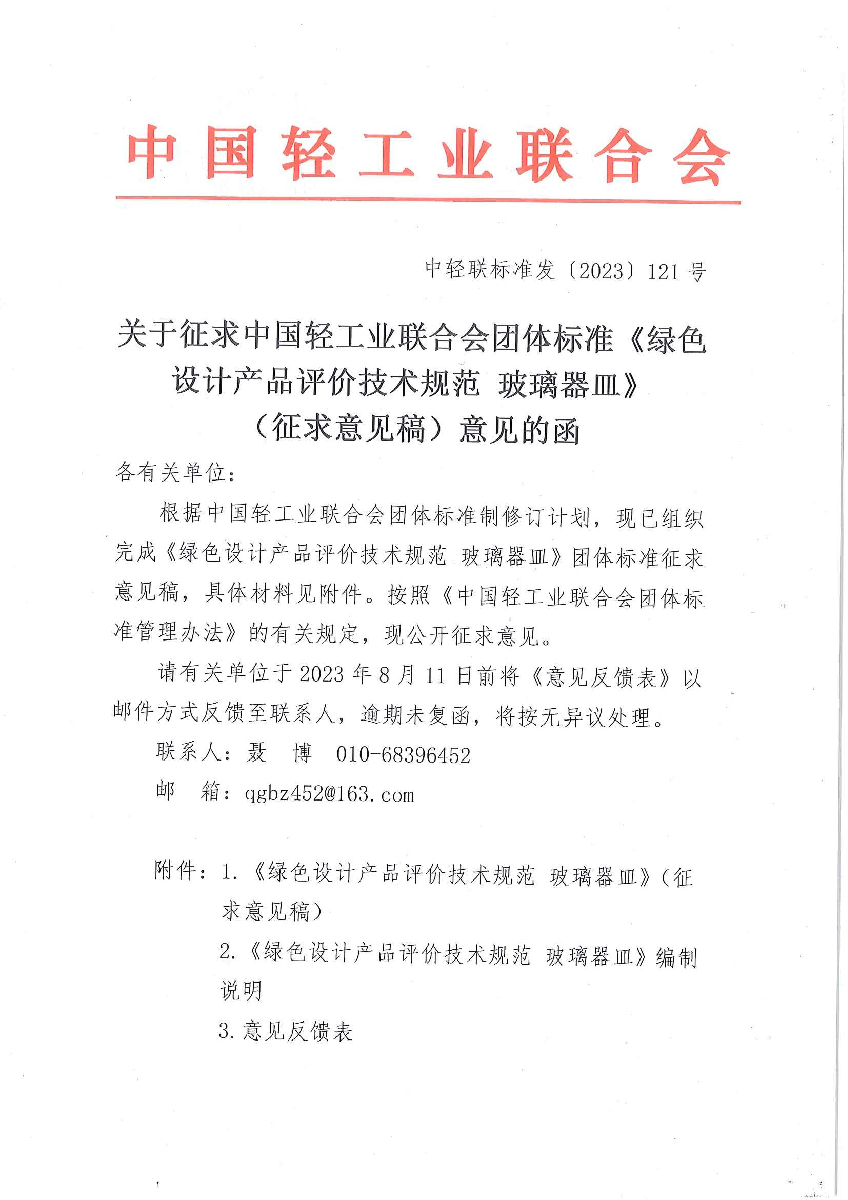 关于征求糖心视频业联合会团体标准《绿色设计产品评价技术规范 玻璃器皿》(征求意见稿)意见的函
