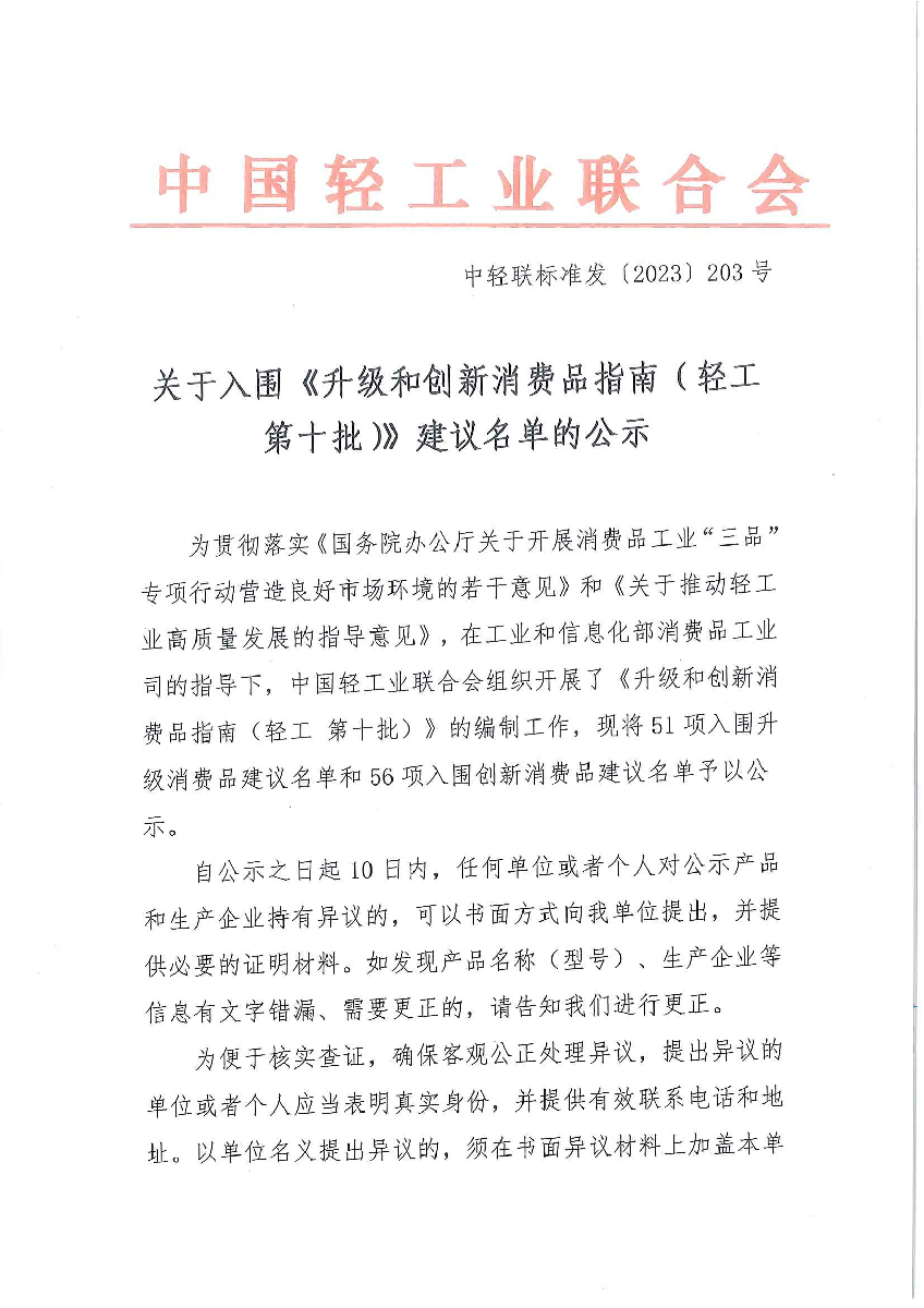 入围《升级和创新消费品指南(轻工 第十批)》建议名单