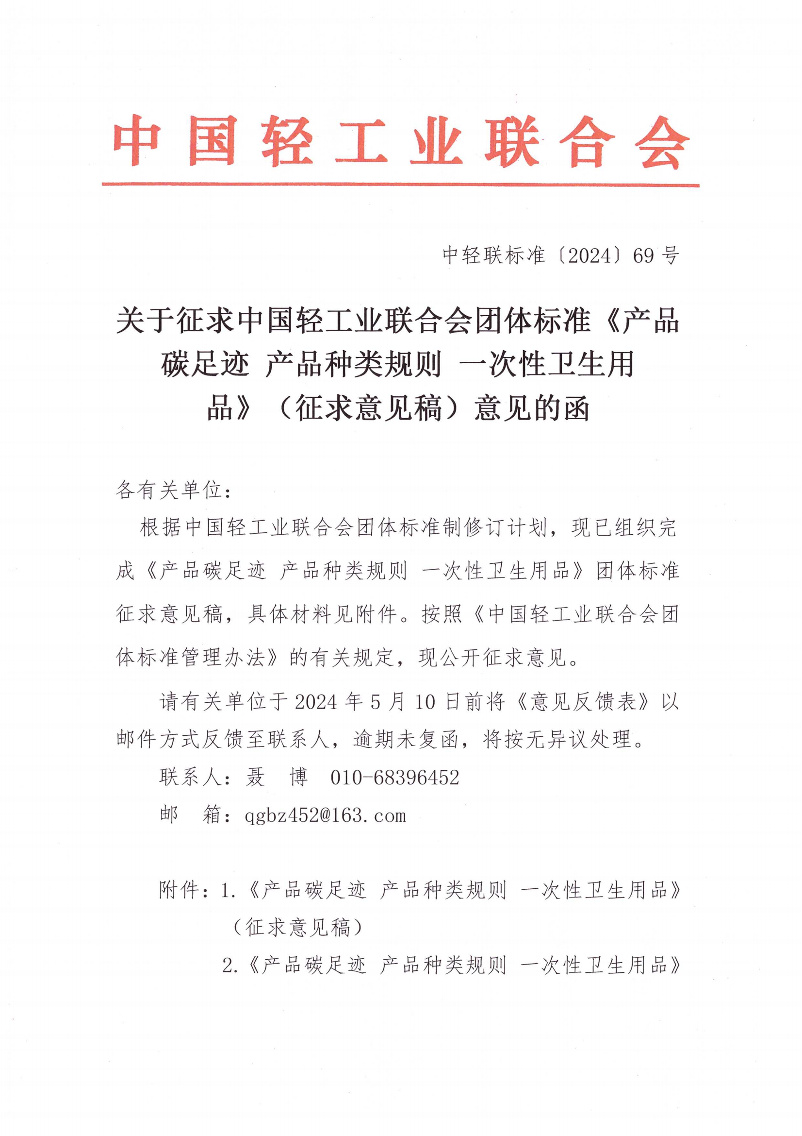 关于征求糖心视频业联合会团体标准《产品碳足迹 产品种类规则 一次性卫生用品》(征求意见稿)意见的函