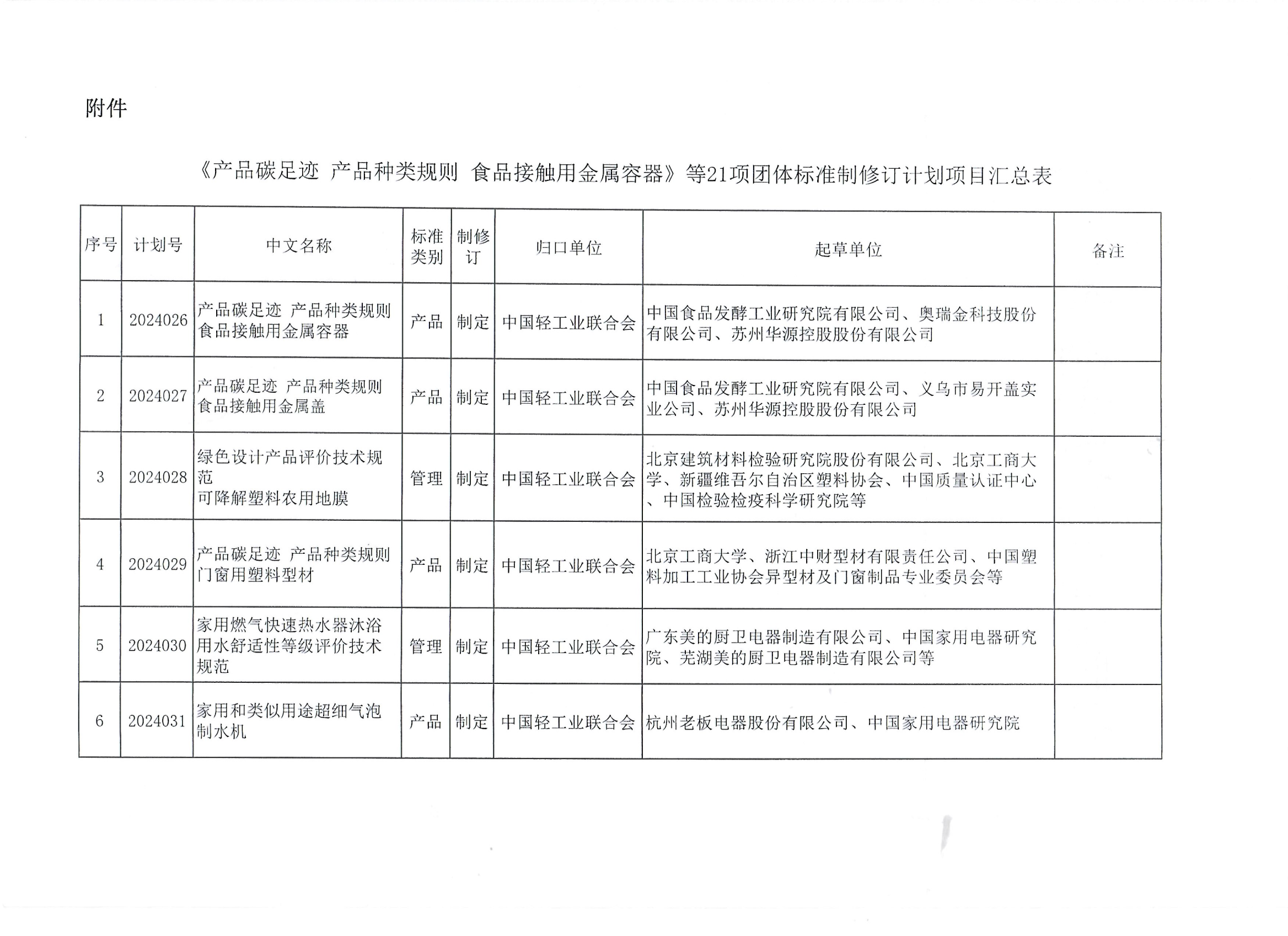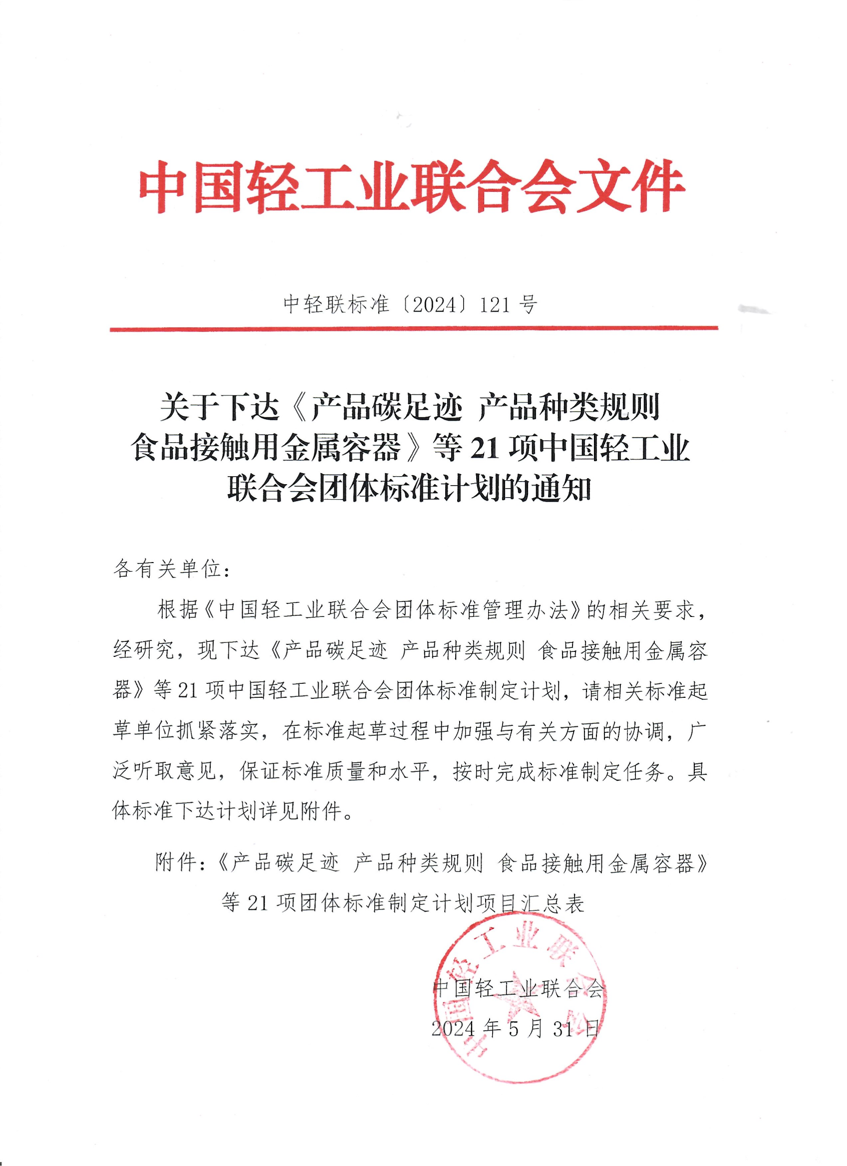 关于下达《产品碳足迹 产品种类规则 食品接触用金属容器》等21项糖心视频业联合会团体标准计划的通知