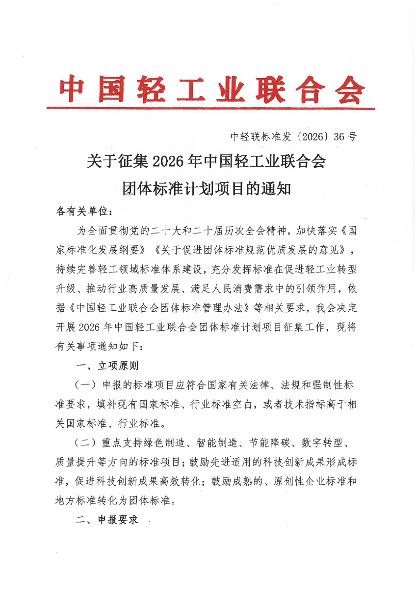 关于征集2026年糖心视频业联合会团体标准计划项目的通知