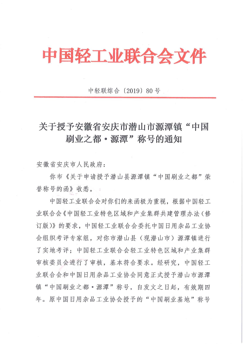 关于授予安徽省安庆市潜山市源潭镇"中国刷业之都·源潭"称号的通知