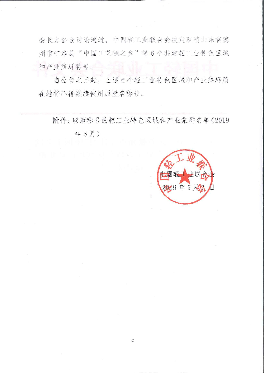 关于取消山东省德州市宁津县“中国工艺毯之乡”等6个轻工业特色区域和产业集群称号的公告