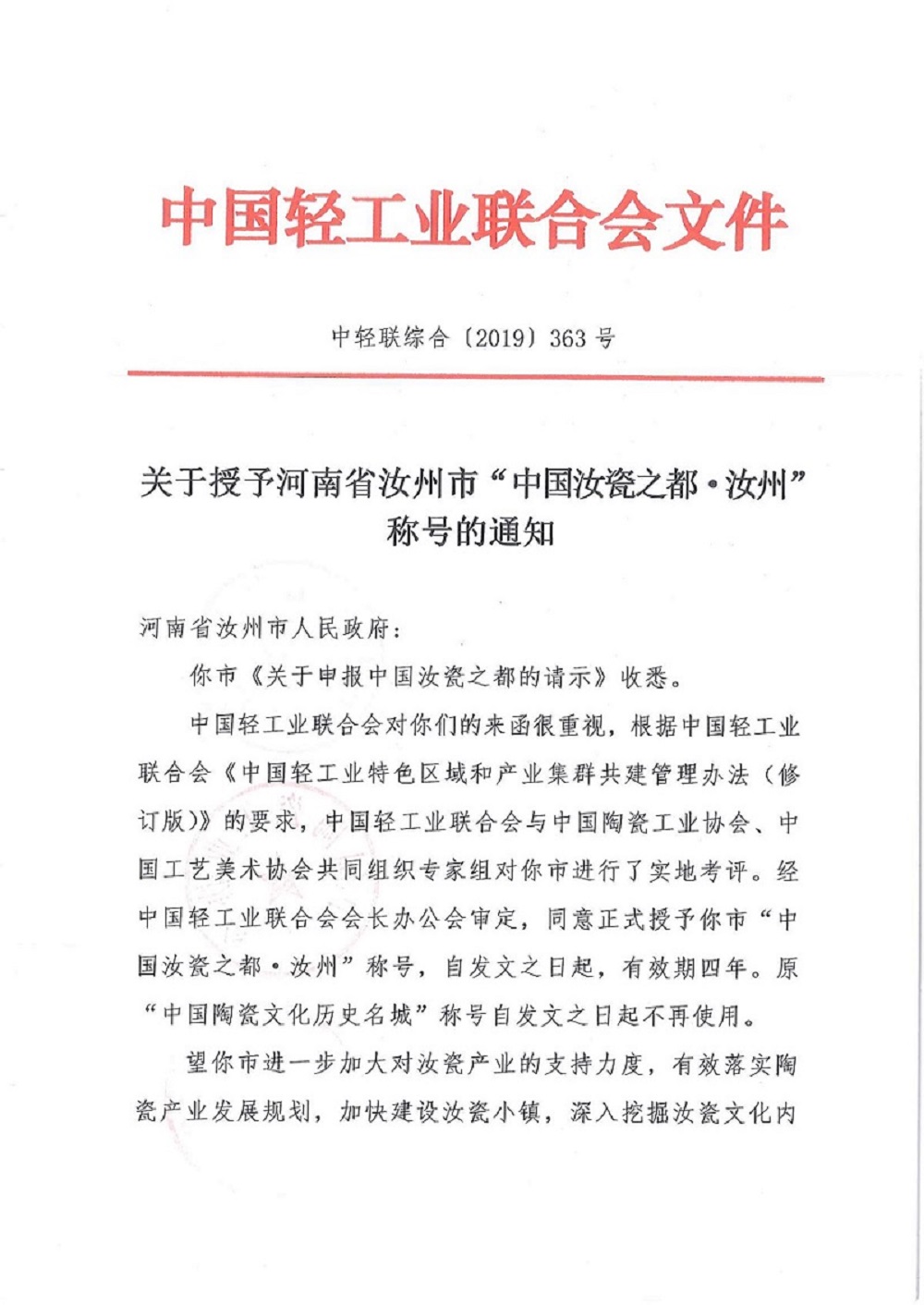 关于授予河南省汝州市“中国汝瓷之都·汝州”称号的通知