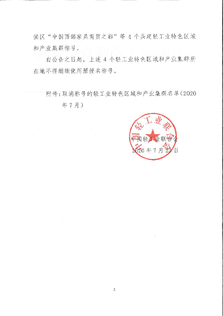 "糖心视频网站" 关于取消四川省成都市武侯区“中国西部家具商贸之都”等4个轻工业特色区域和产业集群称号的公告