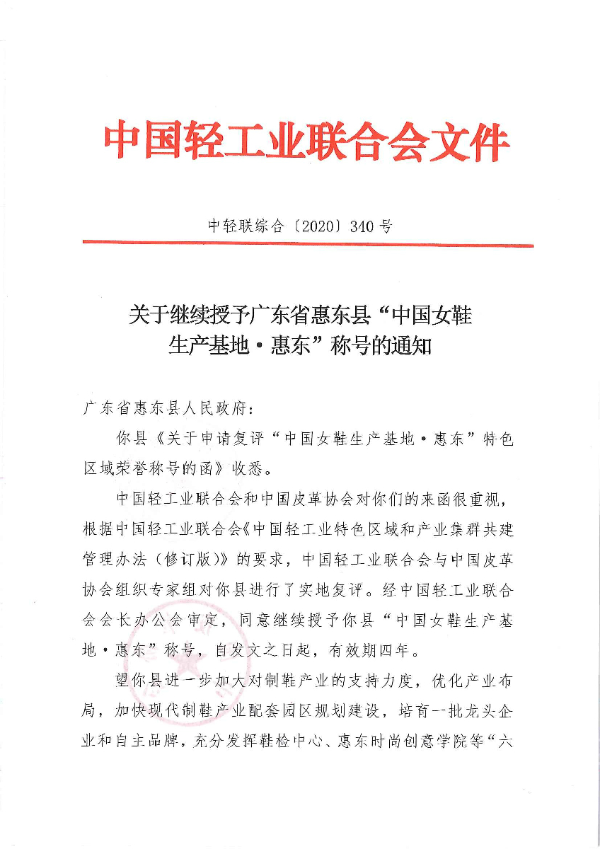 糖心视频高清 - 关于继续授予广东省惠东县“中国女鞋生产基地·惠东”称号的通知