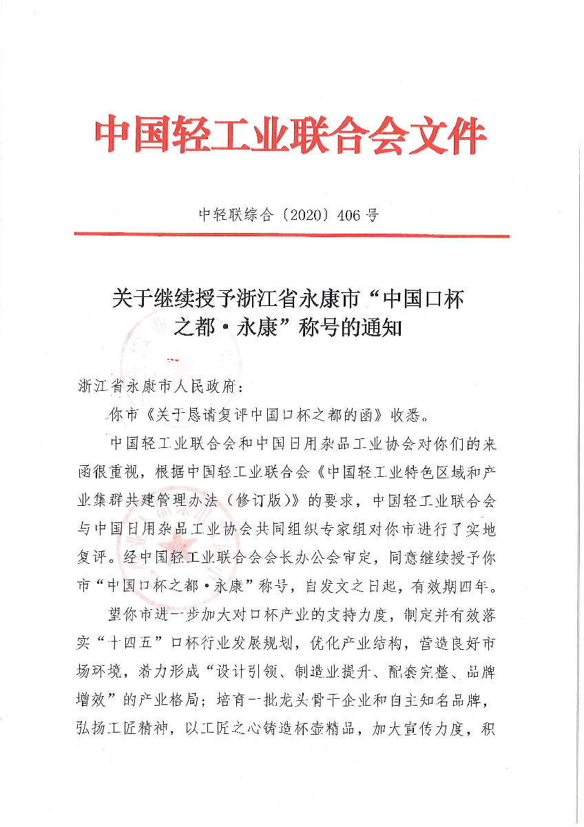 关于继续授予浙江省永康市“中国口杯之都·永康”称号的通知