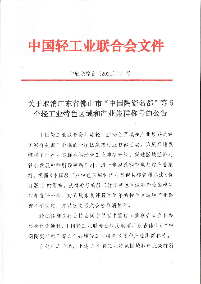 关于取消广东省佛山市“中国陶瓷名都”等5个轻工业特色区域和产业集群称号的公告