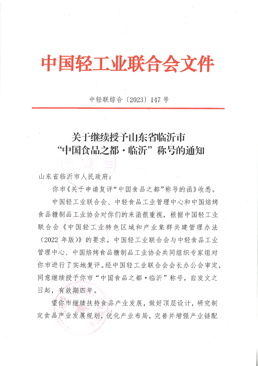 关于继续授予山东省临沂市“中国食品之都·临沂”称号的通知