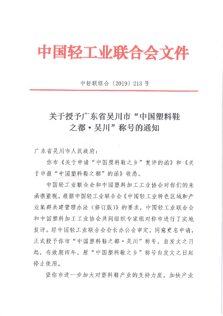 关于授予广东省吴川市“中国塑料鞋之都·吴川”称号的通知 (糖心视频网站)