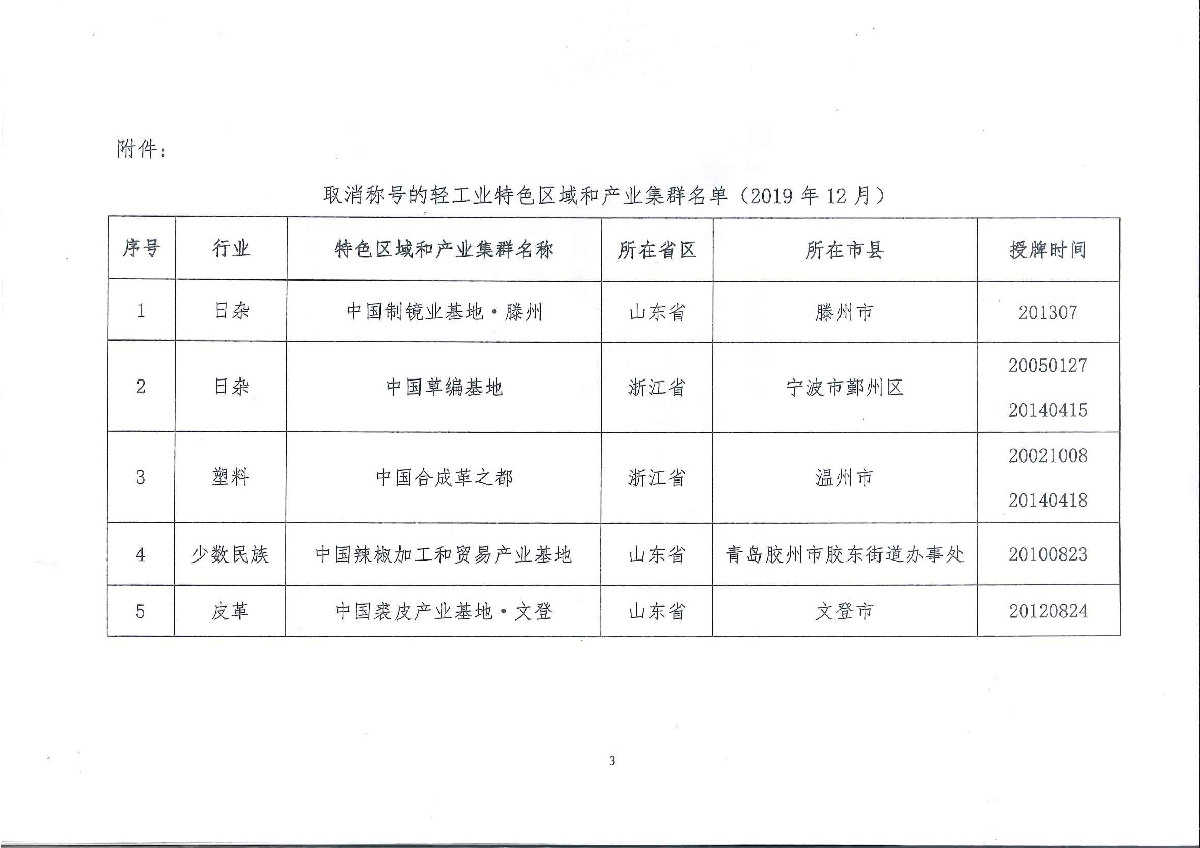 关于取消山东省滕州市“中国制镜业基地·滕州”等五个轻工业特色区域和产业集群称号的公告