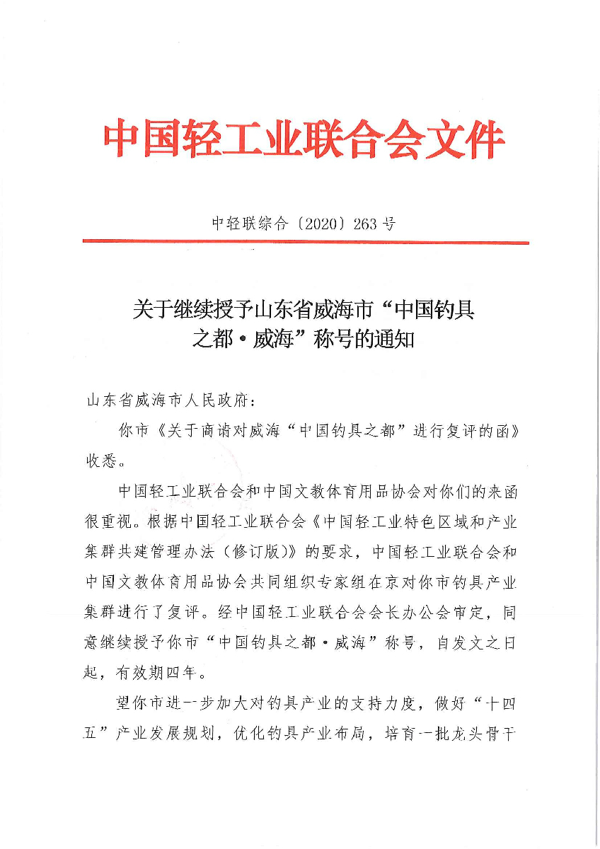 "糖心视频观看" 关于继续授予山东省威海市“中国钓具之都·威海”称号的通知