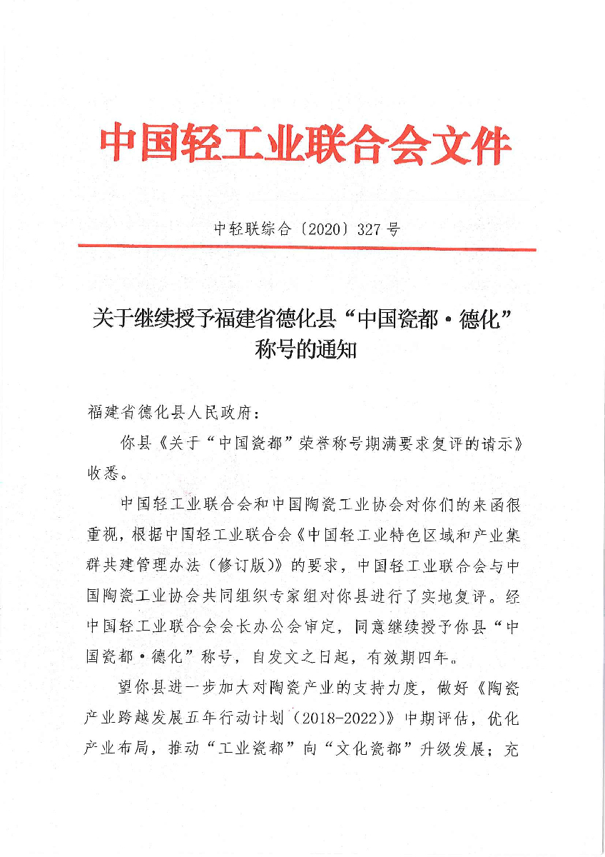 关于继续授予福建省德化县“中国瓷都·德化”称号的通知