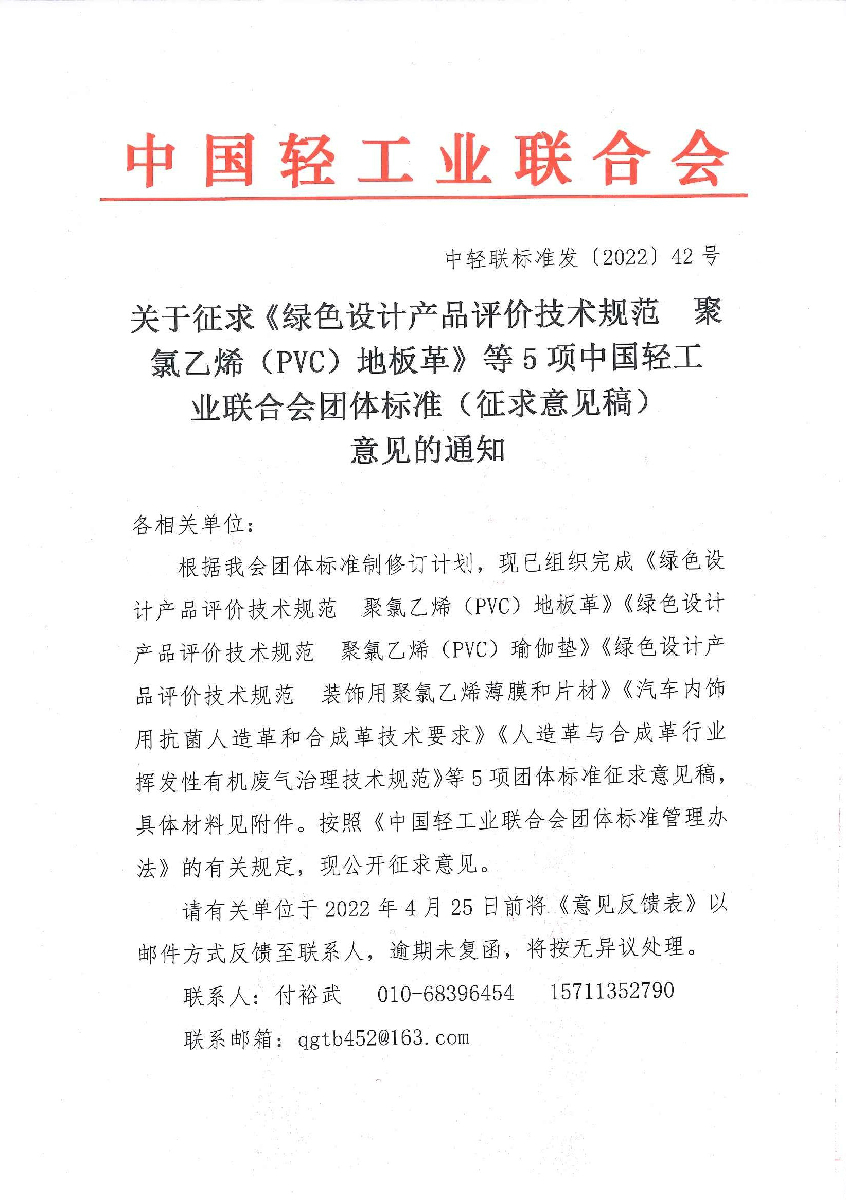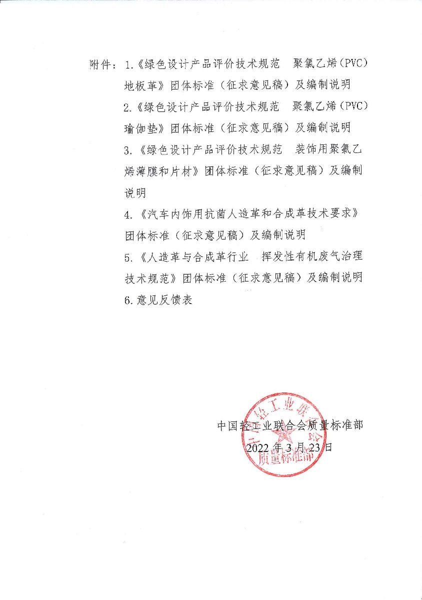 关于征求《绿色设计产品评价技术规范 聚氯乙烯(PVC)地板革》等5项糖心视频业联合会团体标准(征求意见稿)意见的通知