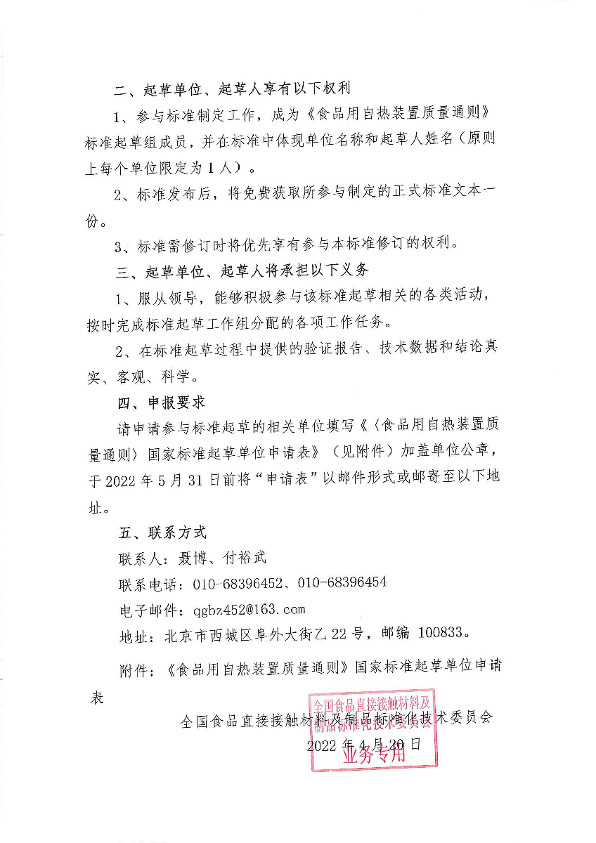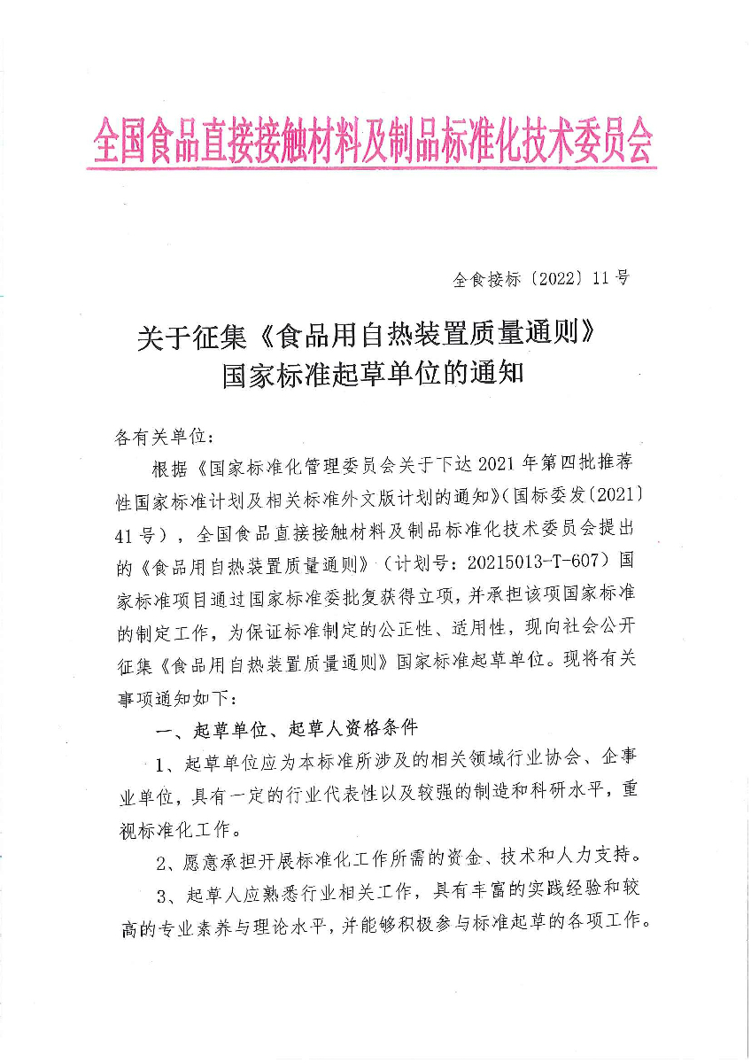 关于征集《食品用自热装置质量通则》国家标准起草单位的通知