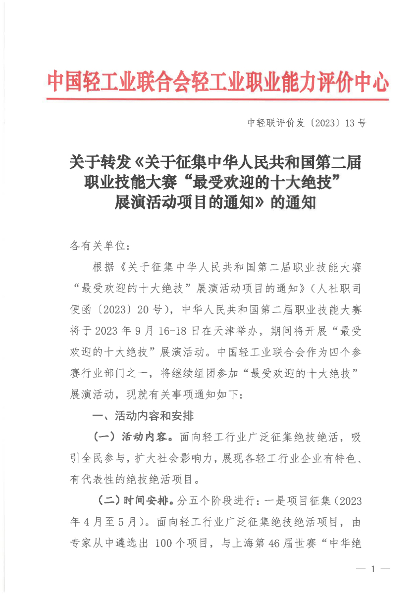 关于转发《关于征集中华人民共和国第二届职业技能大赛“最受欢迎的十大绝技”展演活动项目的通知》的通知