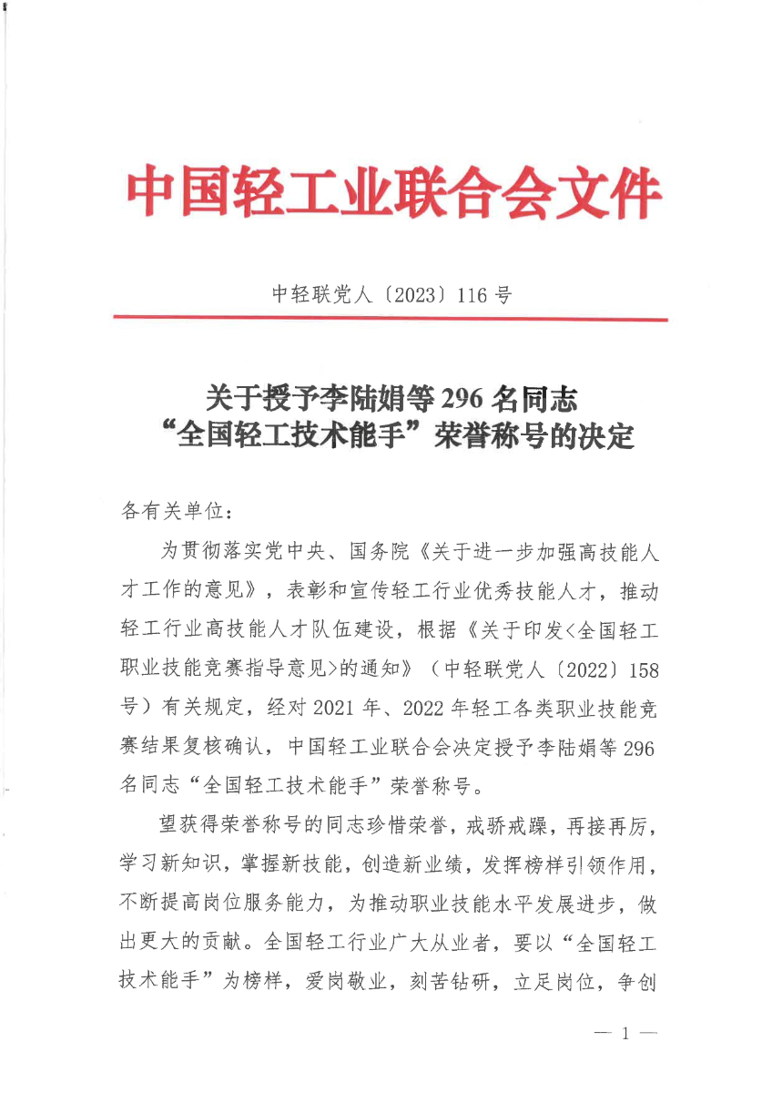 关于授予李陆娟等296名同志“全国轻工技术能手”荣誉称号的决定. pdf