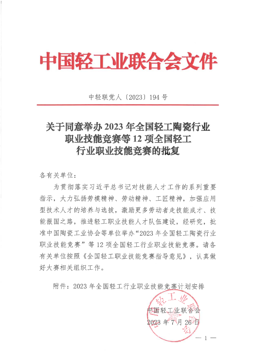关于同意举办2023年全国轻工行业职业技能竞赛的批复